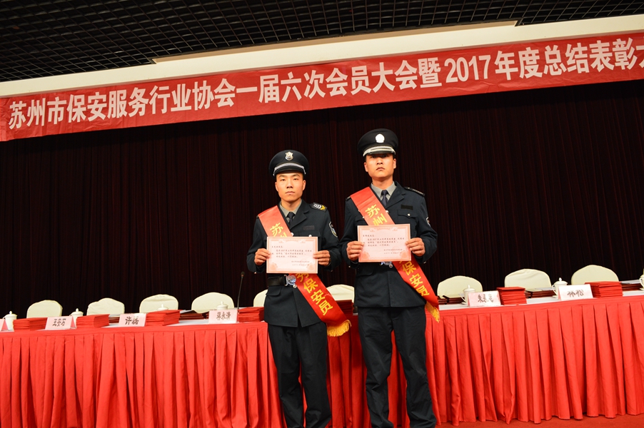 会议首先进行了颁奖仪式,领导先后对2017年度苏州市获得荣誉的保安服务单位和保安员授予了铜牌和证书。其中,jc聚彩保安员王毛旦、李伟光在2017年的工作中表现突出、贡献卓越,获得了“苏州市保安员”的荣誉称号。